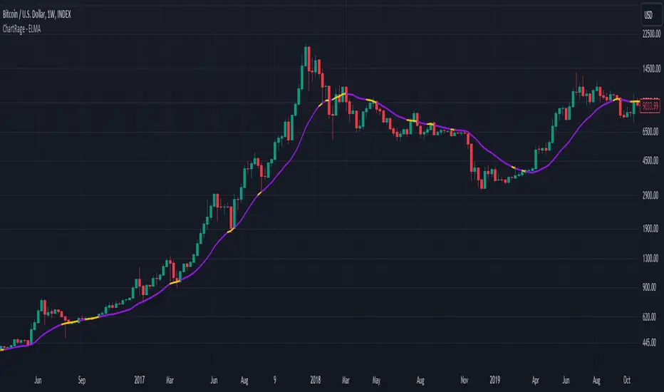 Signals occur not after a candle closes but when price interacts with the ELMA level, providing real time signals by shifting color. (default = yellow)