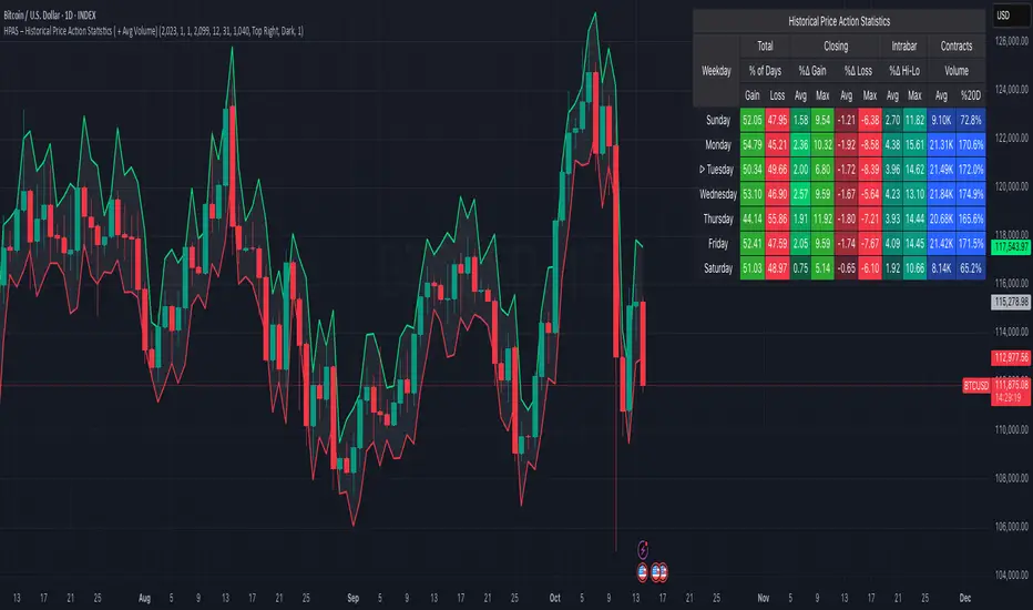 HPAS – Historical Price Action Statistics (v7)A data-driven overview of weekday behavior: price, volatility, and volume.