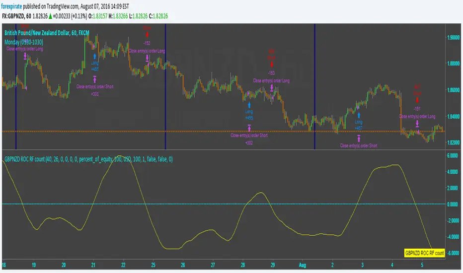 Code takes six pairs that are highly correlated to GBPNZD and determines if their ROC's are increasing or decreasing. If a pair has an increasing ROC it is given a 1, if decreasing a -1. The numbers are all added up (this is similar to a count for counting cards in blackjack). If the count goes positive the strategy enters a long position, if negative a short position.