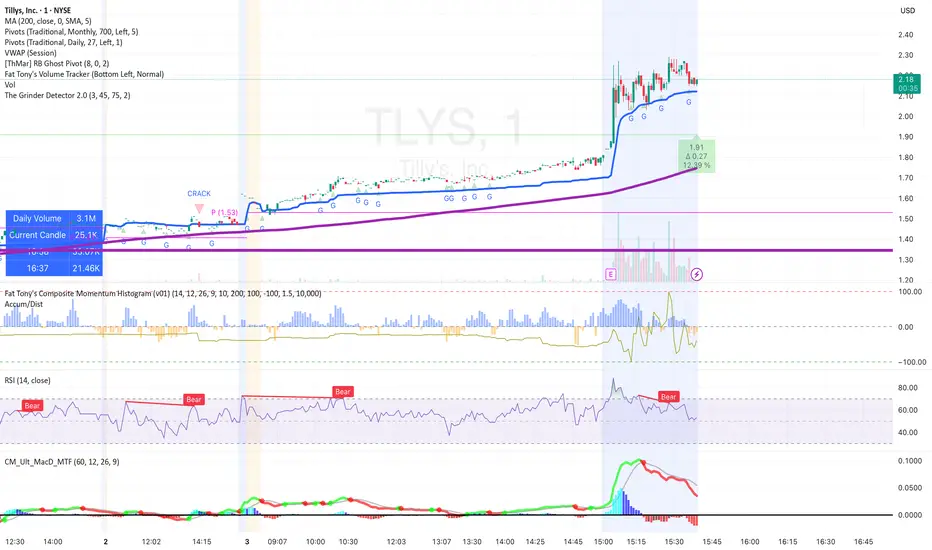 This indicator is designed to identify a specific, dangerous price action pattern known as "The Grinder." A Grinder is a stock that trends upward at a sustainable 45-degree angle, characterized by low volatility and consistent institutional buying. Unlike a "Pump," which goes parabolic and crashes, a Grinder hugs the VWAP and slowly squeezes early short sellers.