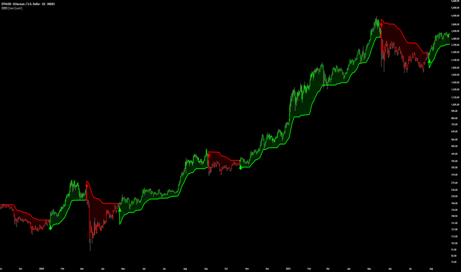 ▶ Bullish Trend (Price Above Upper Band): When price closes above the upper volatility band, the indicator switches to bullish mode with green/bullish coloring throughout all visual elements = Confirmed uptrend signal for trend-following long positions. The trend remains bullish until price breaks below the lower band, allowing traders to stay positioned during sustained upward momentum without premature exits on minor pullbacks within the band range.