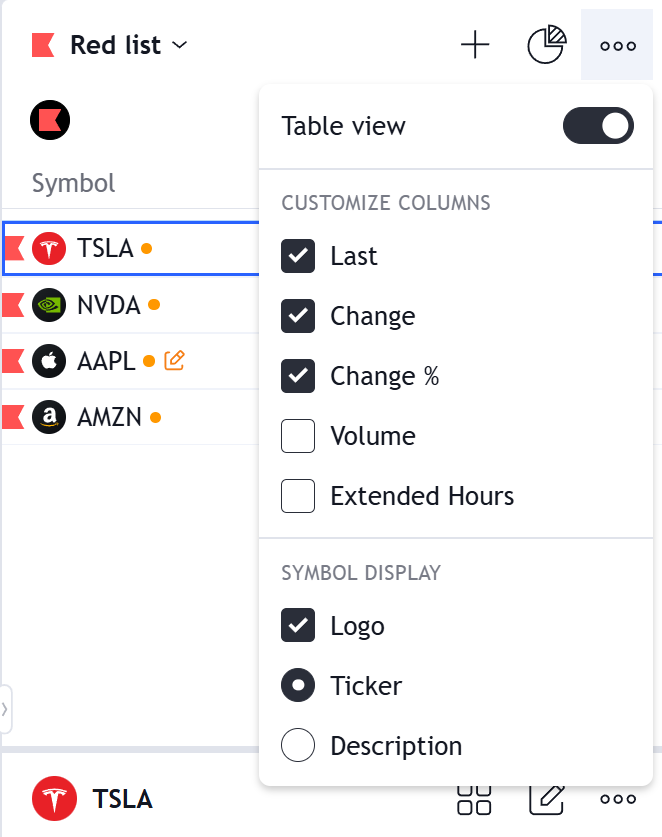 Чтобы добавить или удалить столбцы в списке котировок необходимо нажать на кнопку с тремя точками, которая находится в углу справа от названия списка, и включить/выключить нужные колонки в появившемся меню. Сами символы можно отображать в виде тикера или описания, и к ним можно добавить отображение логотипа.
