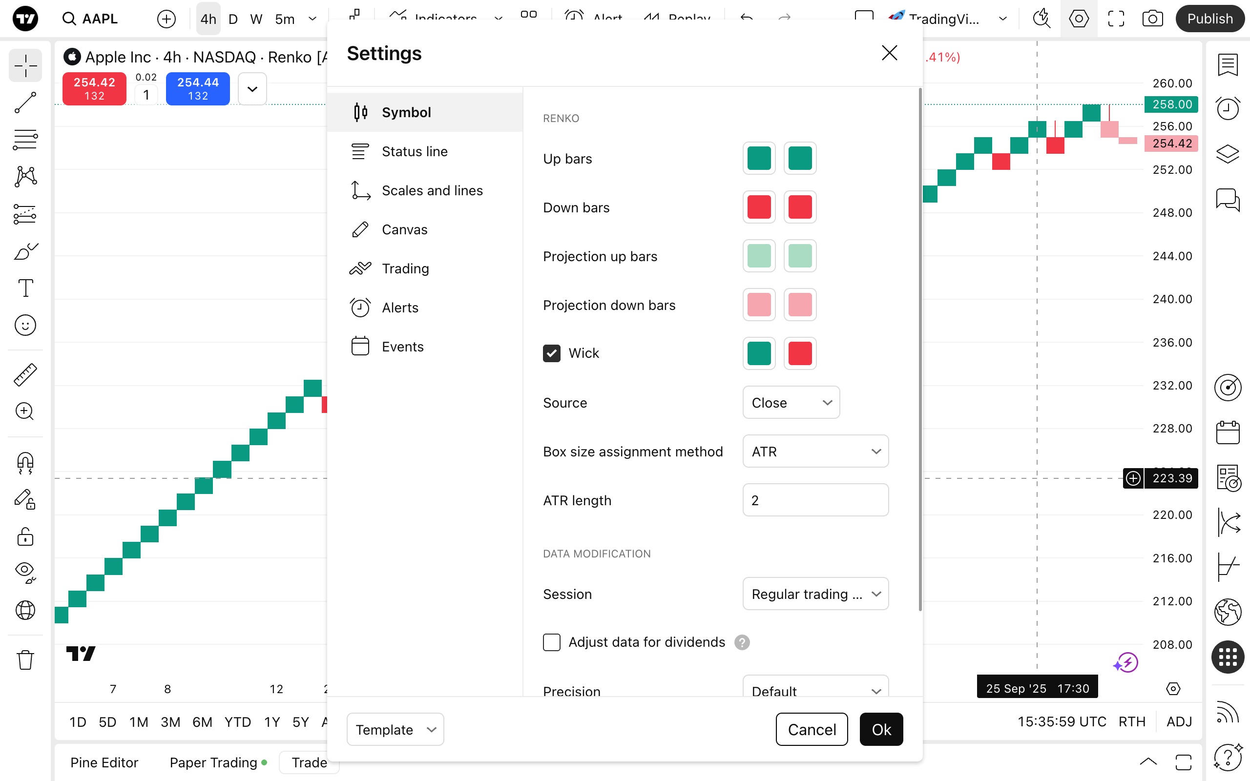 Для точного определения размеров Ренко-баров требуются тиковые данные. TradingView использует цену закрытия интервала графика или значение ОТКР-МАКС-МИН-ЗАКР (OHLC).