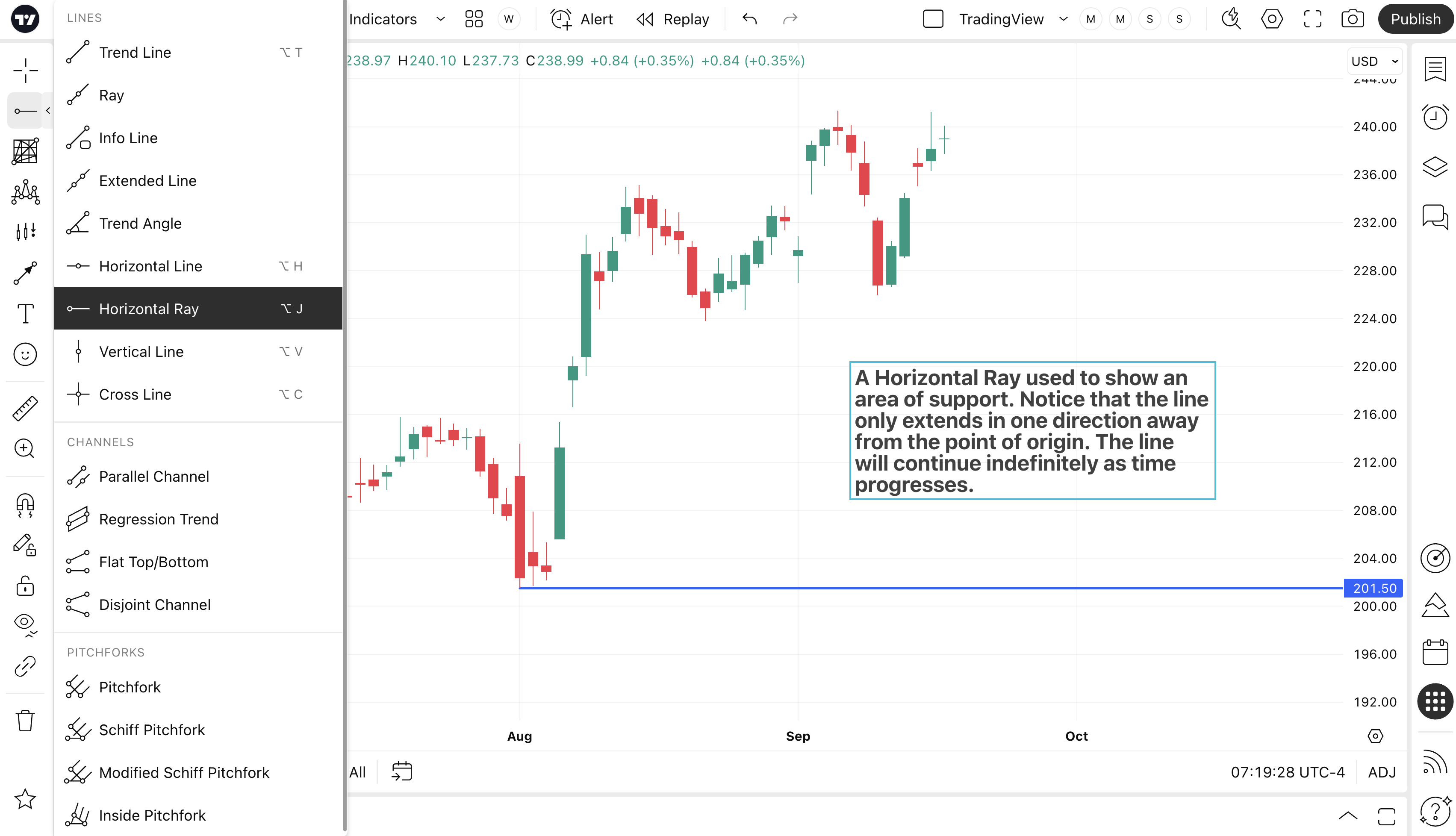 The Horizontal Ray drawing tool is similar to the Horizontal Line or Ray except that it only extends in one direction from left to right. The user places the origin of the ray at their discretion and the ray continues from left to right indefinitely. To draw a ray in any direction, use the Ray drawing.