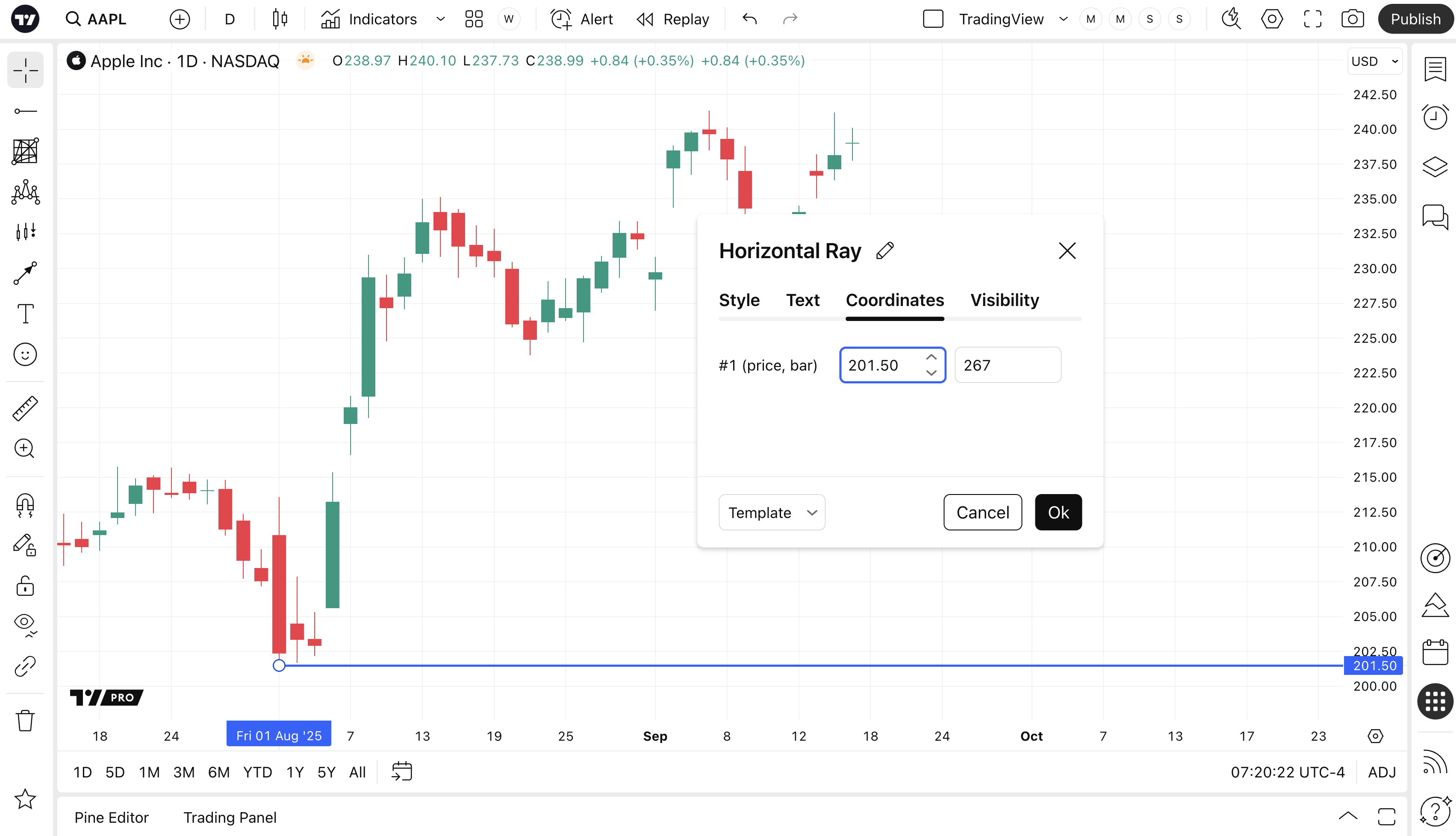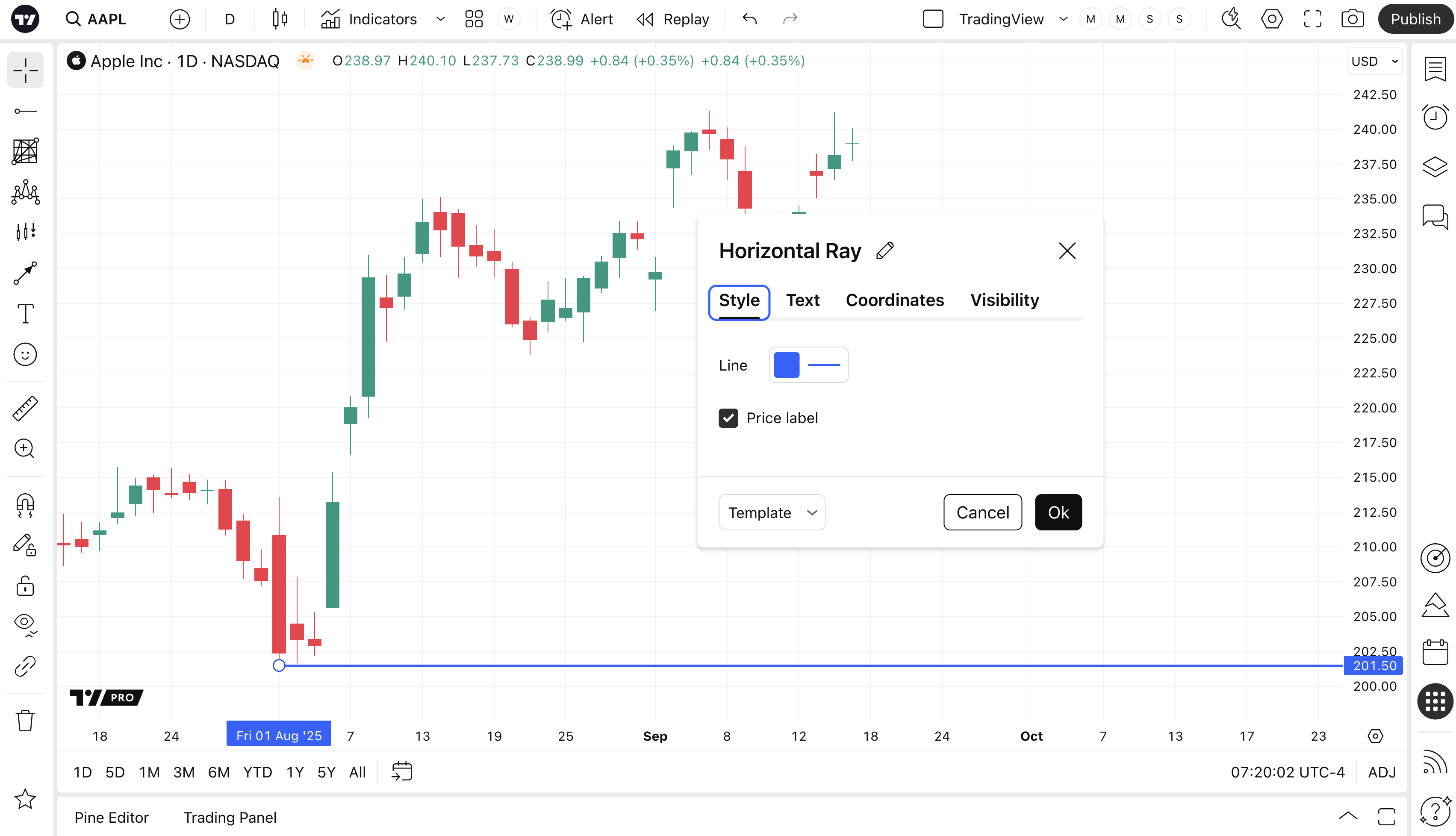 Sets the color, opacity level and thickness of the horizontal ray as well as the ray's line style.