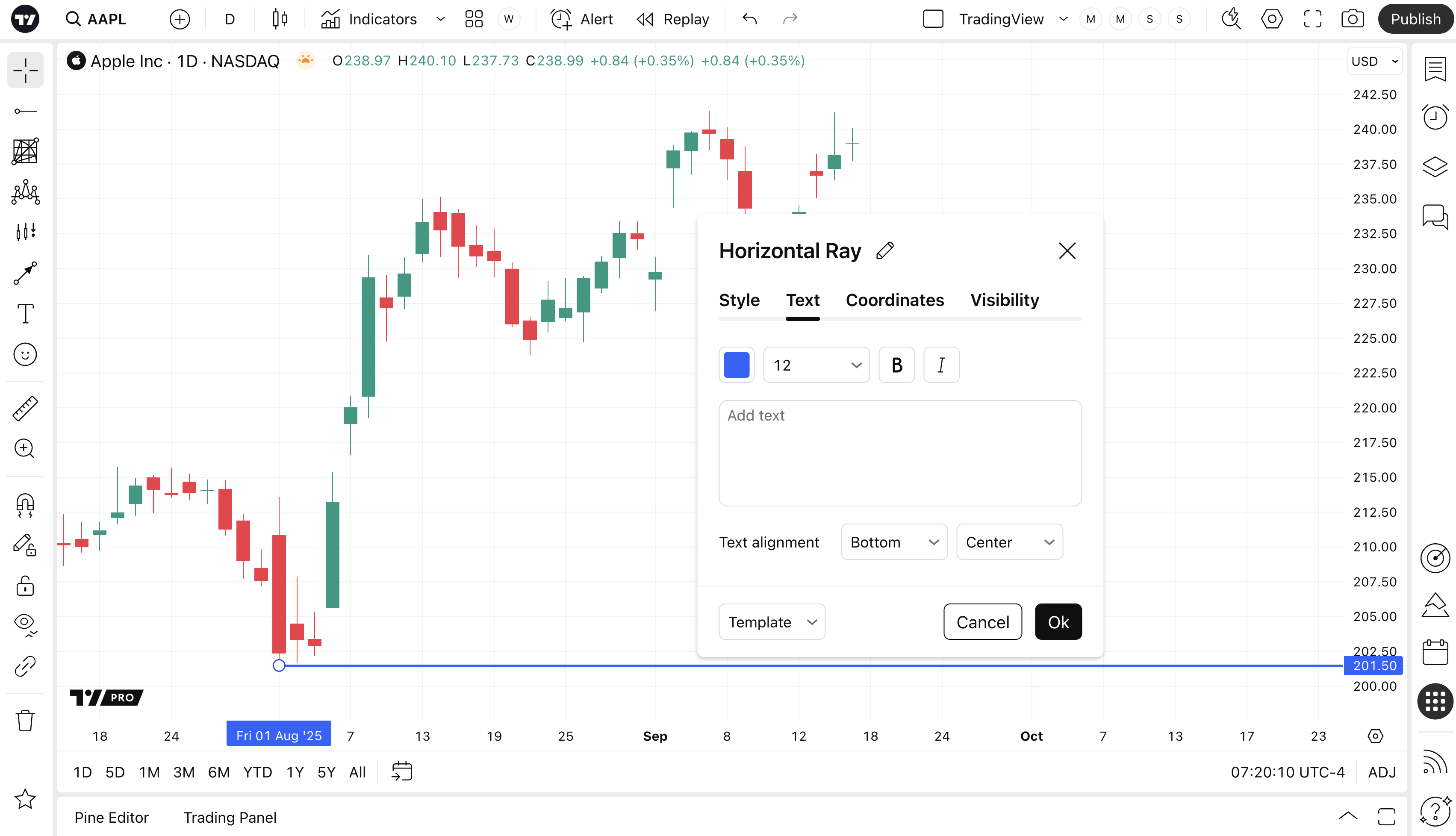 When the Text checkbox is active, a text for displaying beside the horizontal ray may be entered in the text box. Text color and opacity, font size, bold and italic attribute may be assigned in the drop-downs next to the checkbox. Text alignment drop-downs allow to set the text position along the horizontal ray.