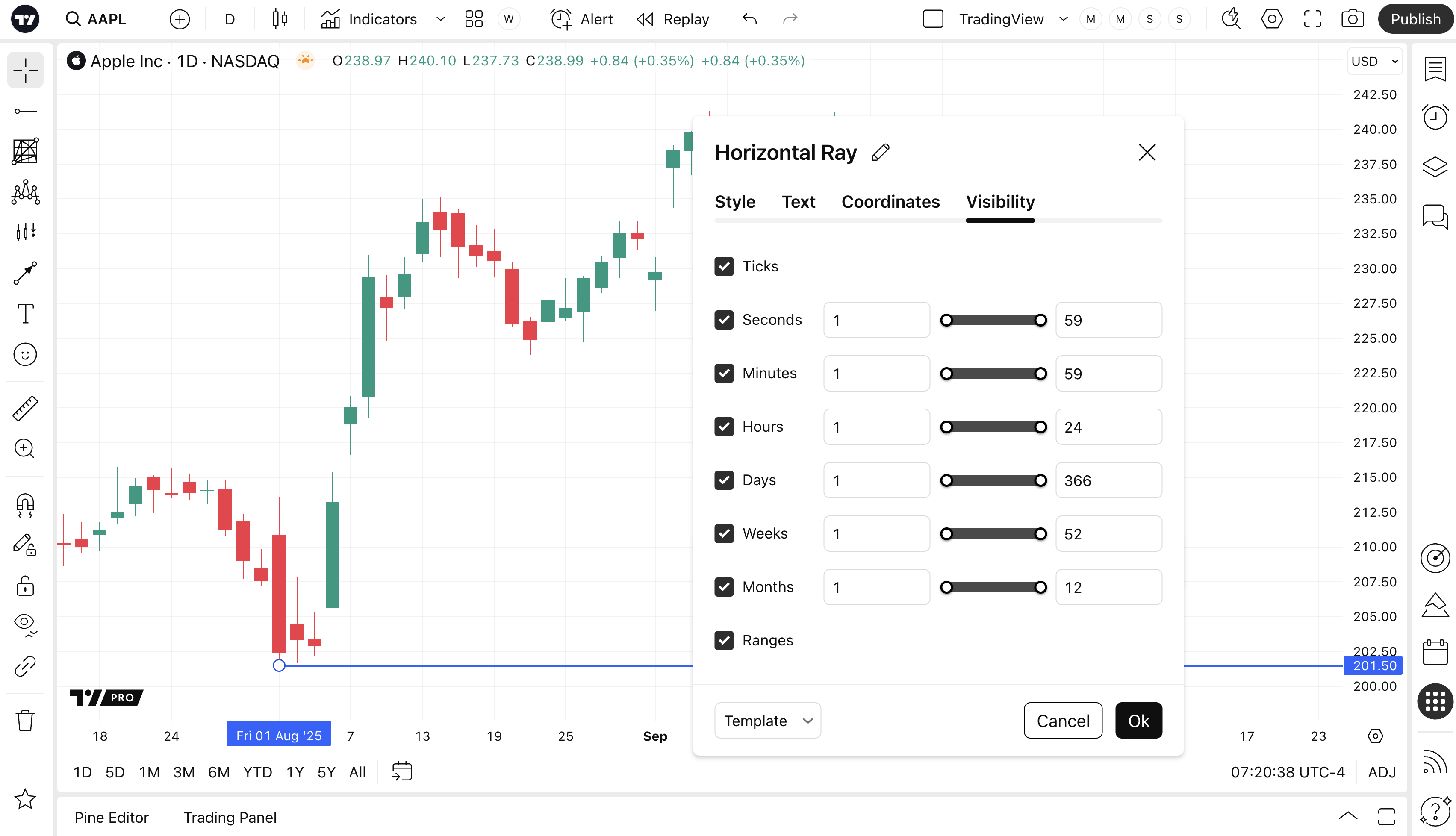 In the Visibility properties dialog, you can switch displaying of a horizontal ray on charts of different timeframes: