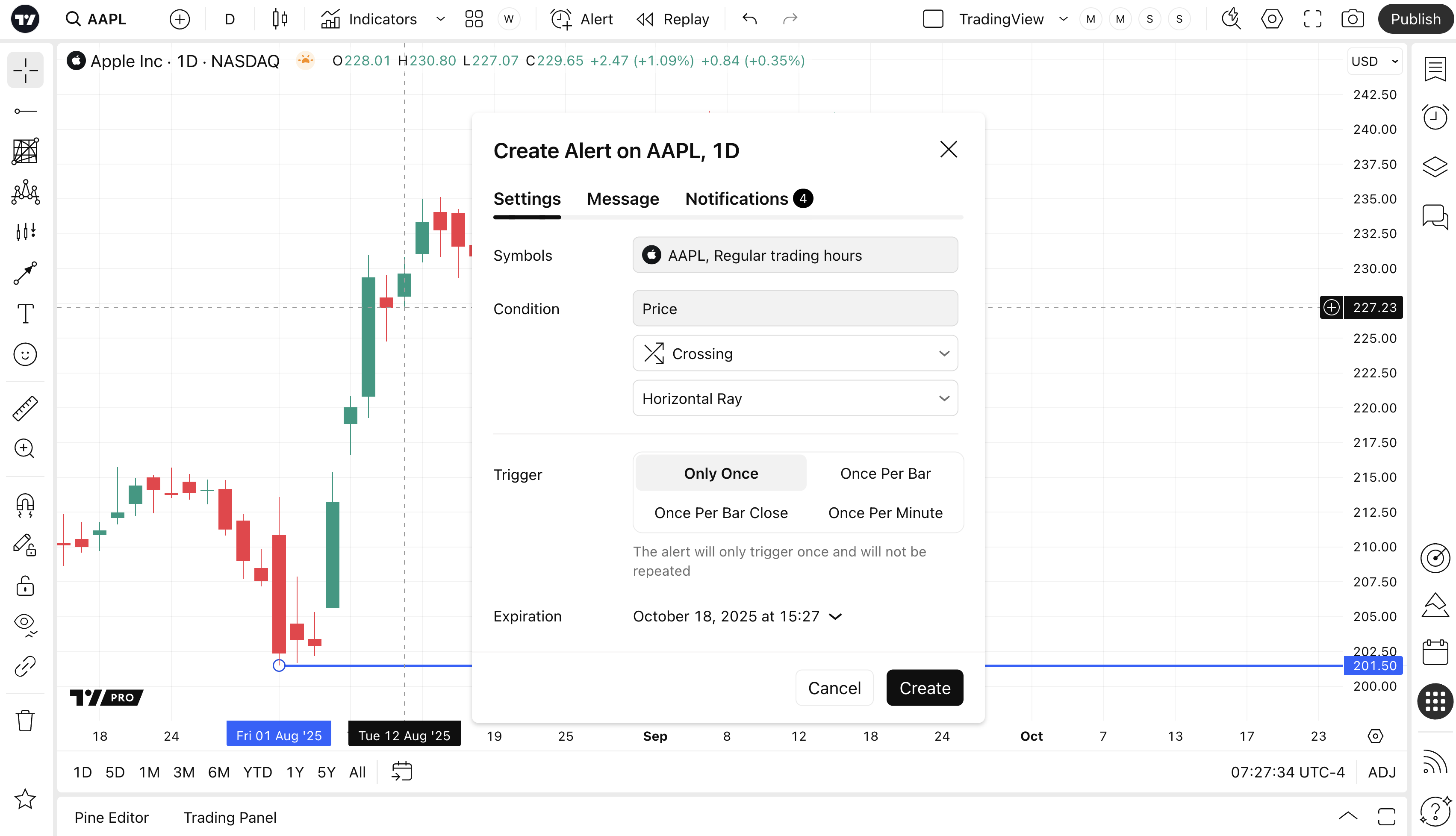 It is possible to set an alert to get notified when a series crosses the Horizontal Ray on a chart. Use the clock icon in floating drawing toolbar or in right click menu on the horizontal ray itself: