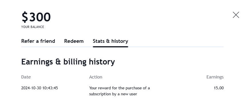 Во вкладке "Приведи друга" будет указано число людей, которые зарегистрировались, перейдя по вашей ссылке, сколько из них приобрели платный план, а также размер бонуса, заработанного за все время.