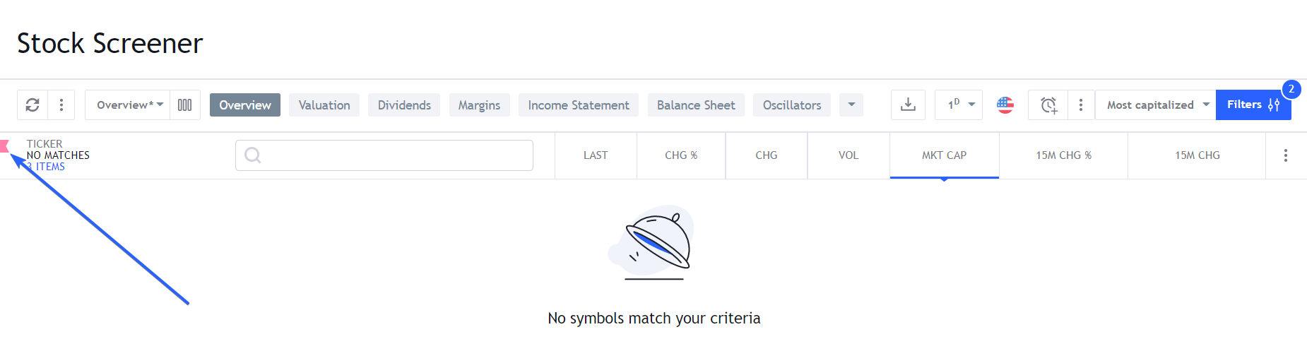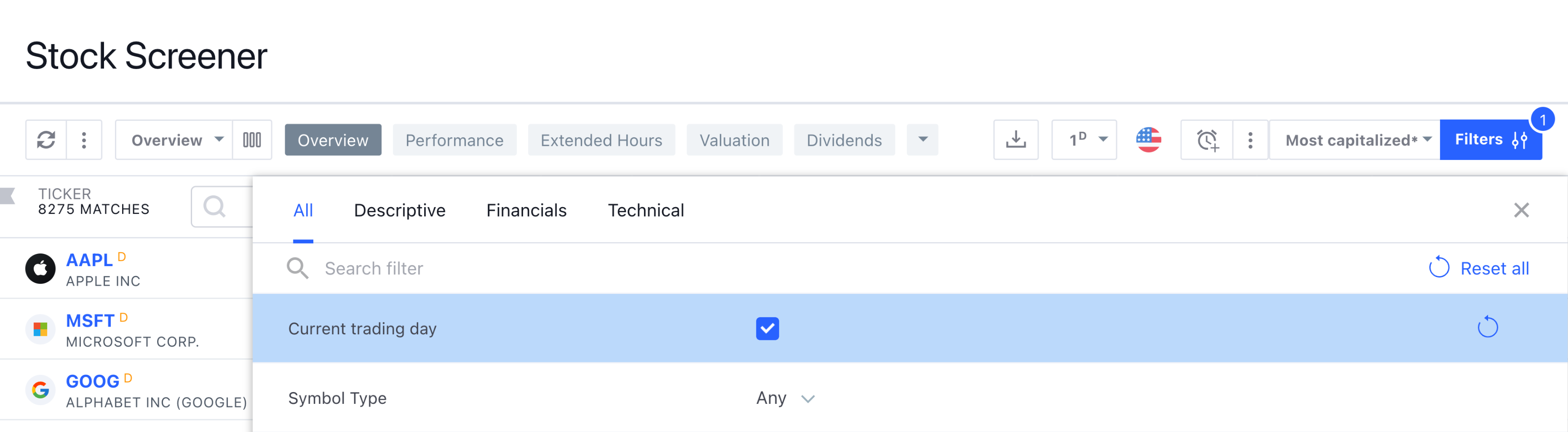 Эта функция удаляет из результатов Скринера символы, которые не торговались в текущей сессии выбранного вами рынка.