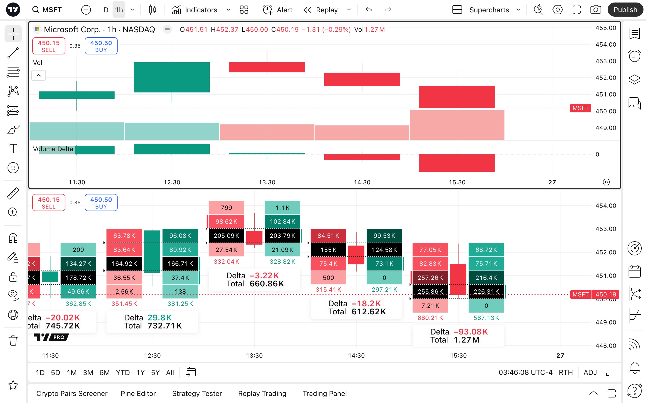 На нижней части представлен график кластерного объёма. Он показывает те же свечи, общий торгуемый объём и дельту объёма, но помимо этого также отображает распределение объёмов покупок и продаж на разных ценовых уровнях внутри каждой часовой свечи.