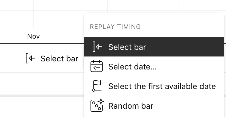 Change starting point: You can switch to a different starting point even during replay. Choose from "Select bar," "Select data," or "Random bar" to establish a new starting point for your analysis.