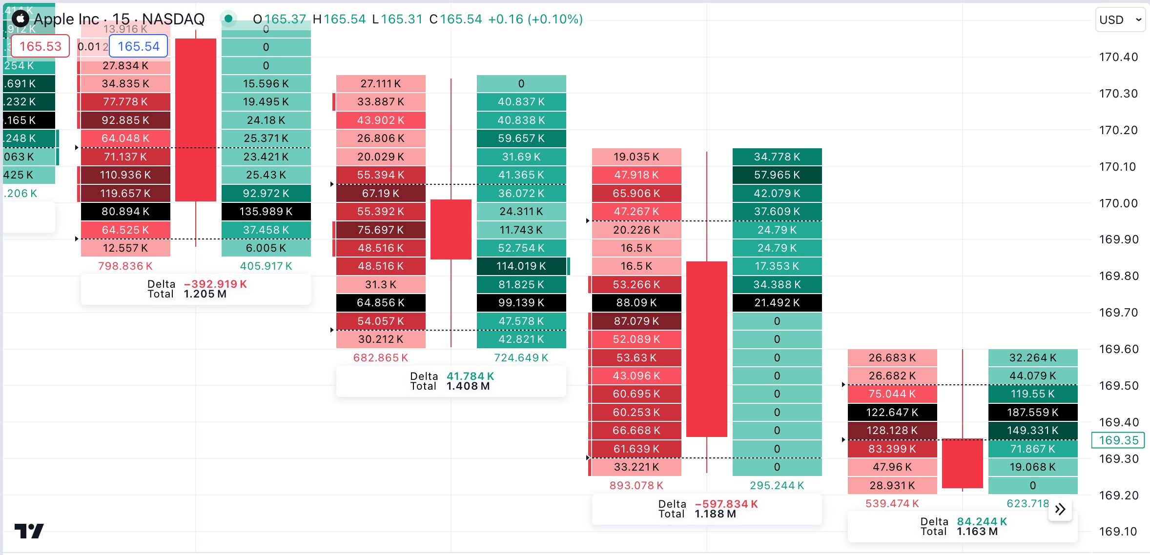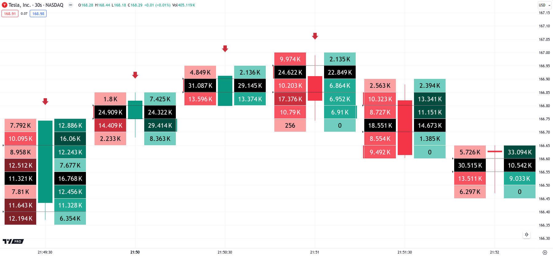 График аккумулирует классифицированный объём на более коротких интервалах по различным ценовым уровням, создавая тем самым кластерное отображение.