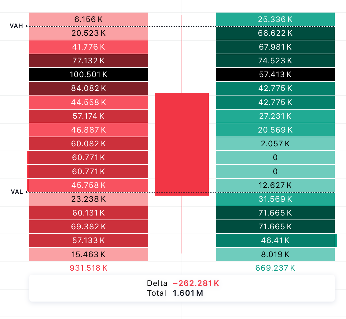 По умолчанию этот тип графика отображает распределение объёма продавцов слева от каждой свечи и объёма покупателей справа, с дополнительными градиентными цветами, обозначающими относительную интенсивность объёма на каждом уровне. Также он размещает вертикальные линии рядом с уровнями в распределении, чтобы подсветить значительные зоны дисбаланса.