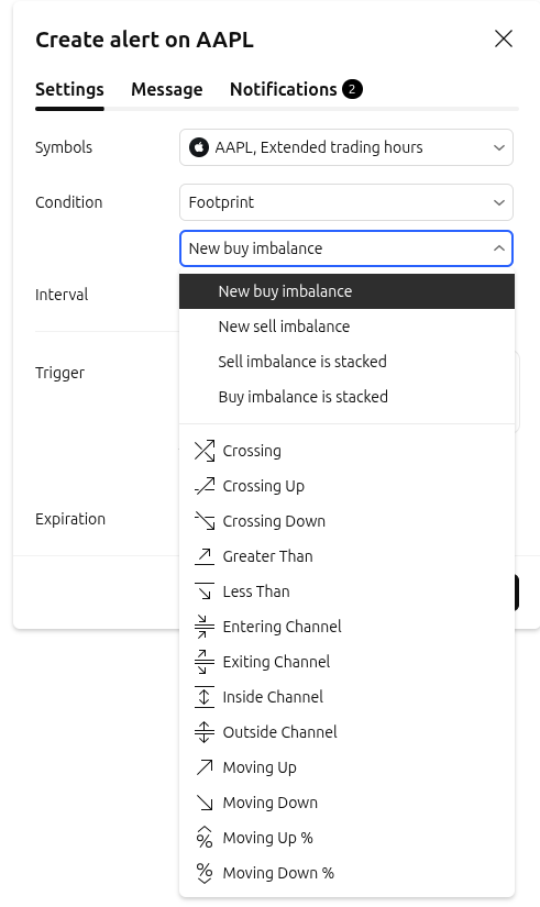 Помимо оповещений на дисбаланс вы также можете настроить их на дельту объёма, общий объём покупок и продаж.