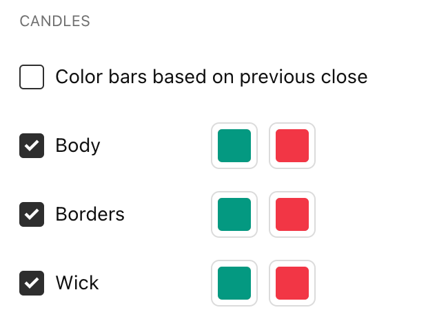 Настройки в разделе Японские свечи идентичны тем, что представлены для стандартного графика свечей. В этой секции вы можете настроить, как свечи будут выглядеть.