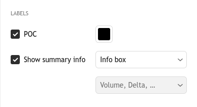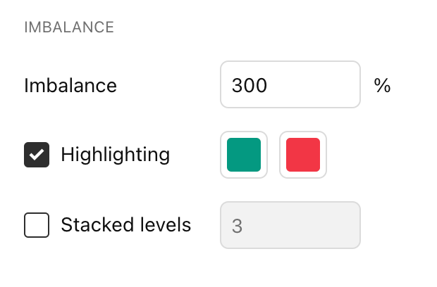 Определяет, будет ли график подсвечивать уровни с дисбалансом, а также задаёт их цвет. Если опция включена, график отображает цветные вертикальные линии рядом с уровнями значительного дисбаланса: дисбаланс покупателей — линия справа от уровня, дисбаланс продавцов — линия слева от уровня.
