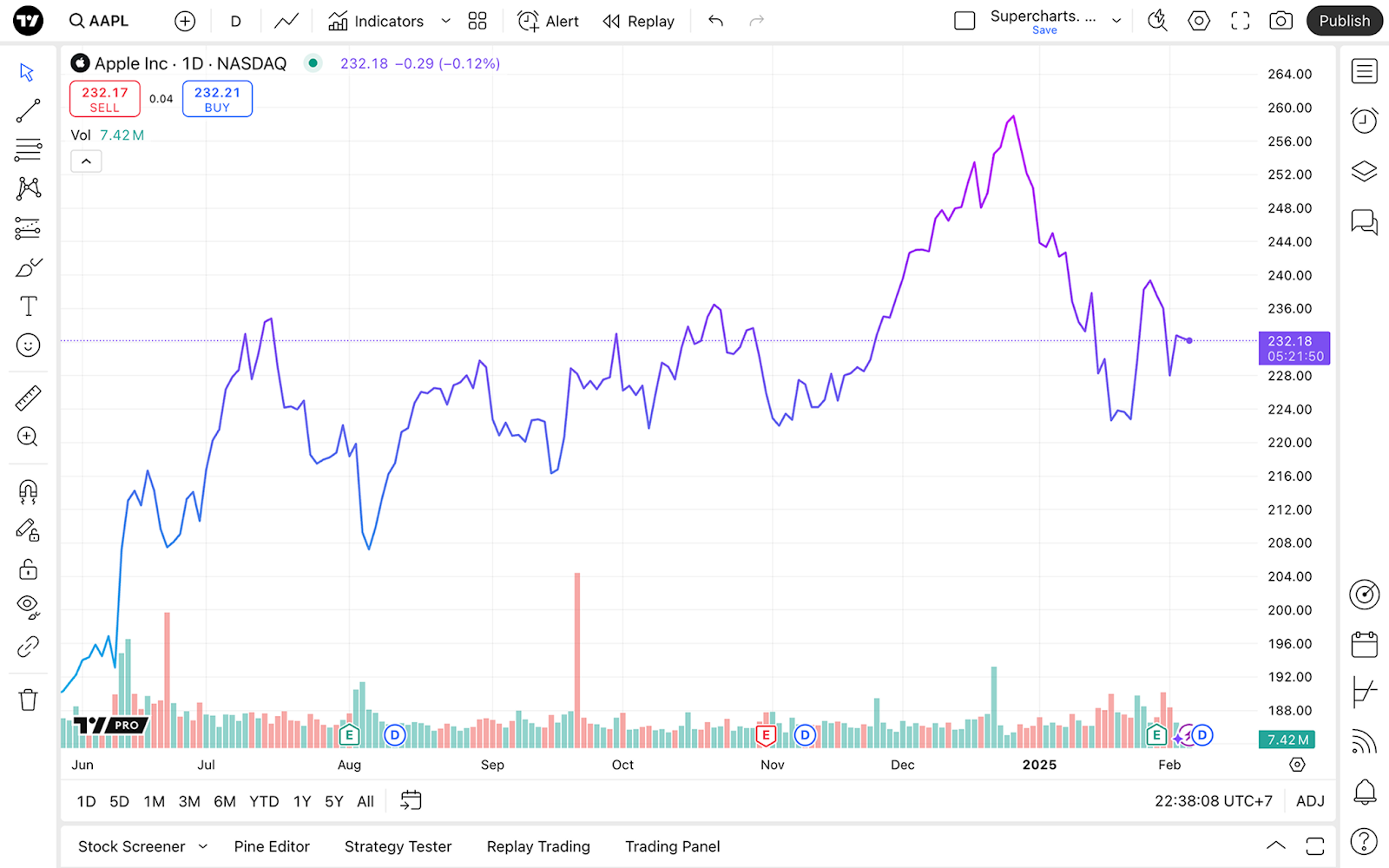 Линейный график — один из самых популярных типов графиков наряду со свечными графиками и графиками баров. Он широко используется в индустрии, так как он простой, легкий для понимания и дает ясное отображение цены. На Суперграфиках он показывает цену актива в течение времени линией, соединяющей точки данных.