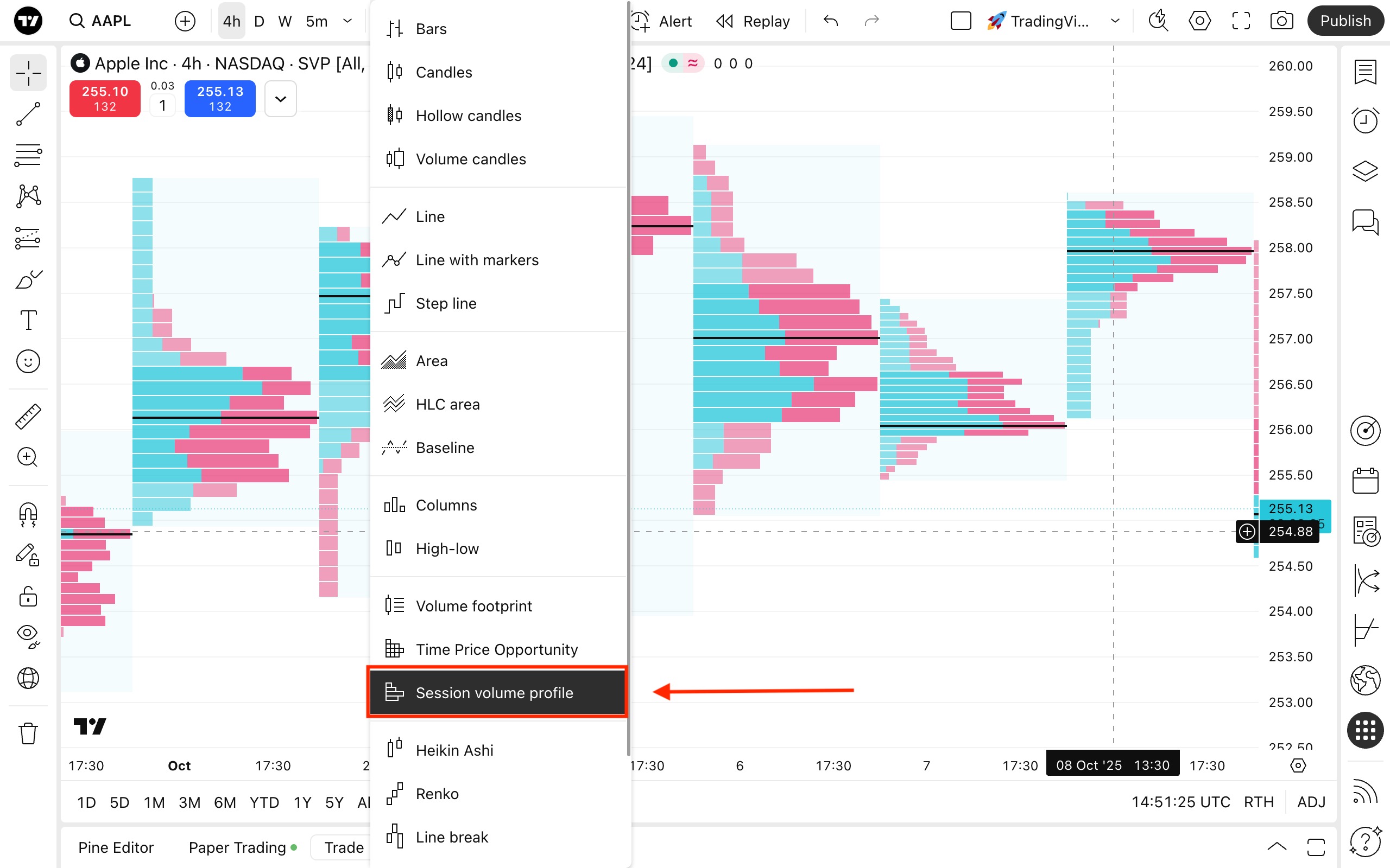 На Суперграфиках откройте меню типов графика на верхней панели инструментов и выберите Профиль объёма за сессию.
