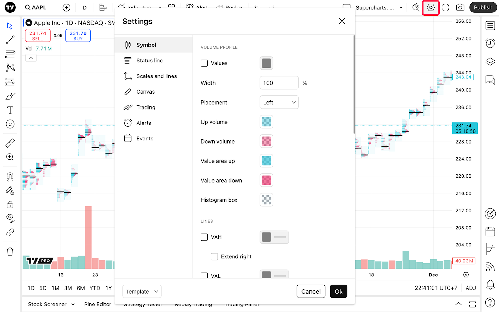 В разделе Линии вы можете включать такие линии, как POC (точка контроля), VAH (верхняя граница зоны стоимости), VAL (нижняя граница зоны стоимости), динамическая точка контроля и динамическая зона стоимости.