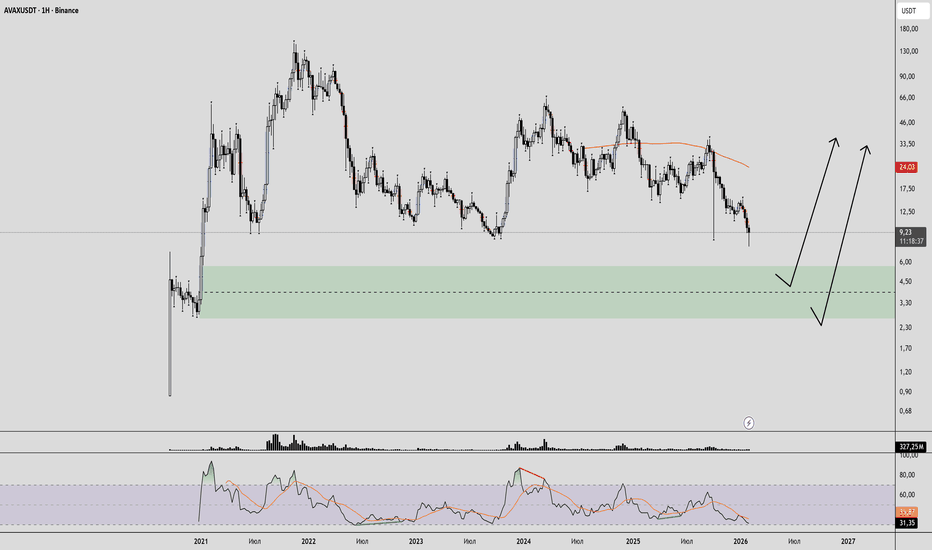 AVAX/USDT Краткий обзор по монетеМонета на перспективу выглядит очень хорошо.Из больших минусов,все "ЗОНЫ ИНТЕРЕСОВ"Закрыты ,единственная цель которую я вижу на графике ,в которую цена точно придем это ретест пробитого уровня.. Мой прогноз:на след бычьем цикле после длительного боковика с последующим выходом увидеть цену в 27$, . На данный момент могут укатать намного ниже до 3$ спокойно...