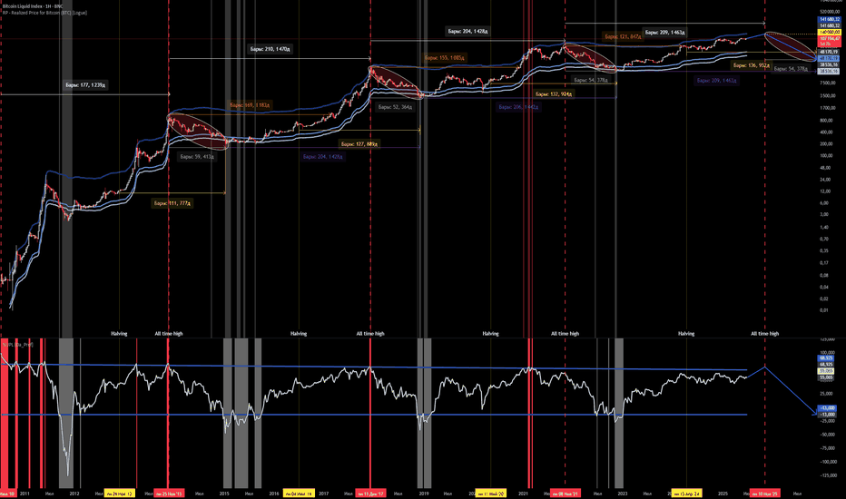 Когда? В этом нам поможет цикличность битка. На графике отображены ключевые этапы в истории цены, четко прослеживающиеся через 4-летние циклы, которые совпадают с событиями халвинга(желтые вертикальные линии). Каждый из них сопровождался ростом до нового ATH(красные вертикальные линии), за которым следовал медвежий рынок и восстановление до следующего бычьего цикла. Если выверить сред. значение в днях и взять статистически в какой период ставился пик, то получаем такой результат: Пик будет поставлен в конце 4 квартале 2025 года(начало ноября-конец декабря).