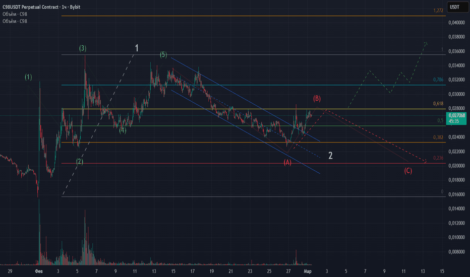 Монета C98. ТФ 1ч. Два сценария.Теперь я вижу два сценария. Пессимистичный сценария - если сейчас нарисовалась волна В и ещё будет волна С снижения (примерно указано на графике красным цветом).
