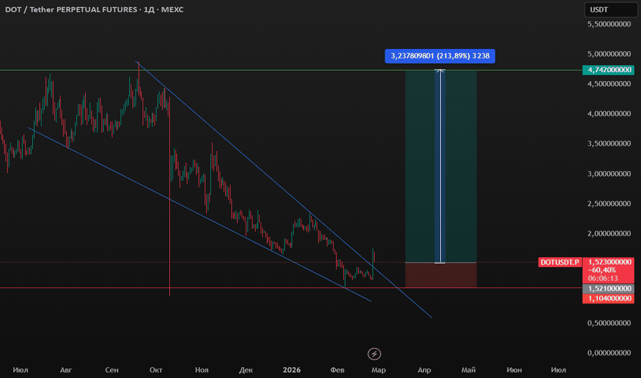 DOTUSDT — нисходящий тренд, отскок к сопротивлениюНа дневном таймфрейме сохраняется выраженный нисходящий тренд. Цена последовательно формирует lower high и lower low. После импульсного пролива к зоне 1.24 произошёл технический отскок.