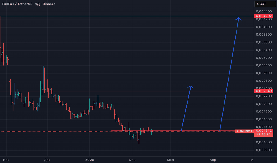 FUN смотрит на пробой. Всем привет. Смотрел графики, и понравилась монета FUN смотрит на пробой. Возможно вы заметили что очень часто монеты пампят на 100-500% я изучал их график и FUN токена очень похожая концепция. Взял с целю на пробой. Если не будет пробой мы пойдем к второй зоне которою отметил на графике. Всем профита.