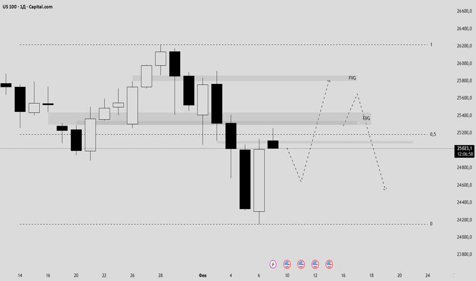 US100: импульсный слив в discount — отскок в FVG и разворот от 0На D1 по US100 после подъёма рынок дал резкое медвежье смещение и пришёл в нижнюю часть диапазона — зона discount с ближайшими лоями как очевидной ликвидностью. Выше отмечены несколько FVG: часть ближе к текущим, часть — в районе 0.5 и выше. Сценарий по разметке: сначала возможен добор вниз/снятие о