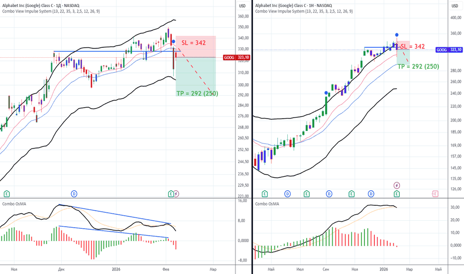 Alphabet (Goog) продажа дневной таймфрейм4 февраля сформировался сигнал на продажу по Alphabet (Google). На дневном графике уровень 328 цена тестировала несколько раз: 25 ноября и в период с 8 января по 4 февраля. После позитивного отчёта цена в итоге опустилась ниже этой отметки. На дневном графике наблюдается двойная дивергенция.