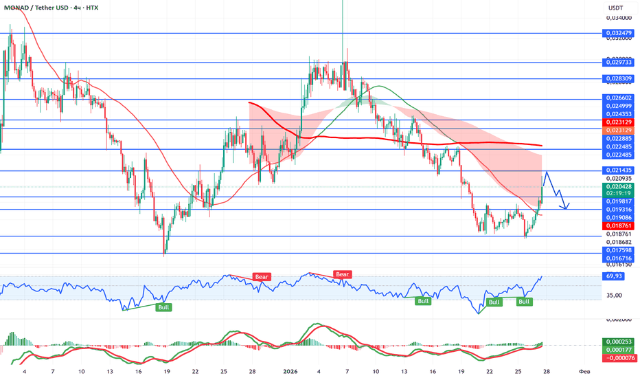 #MONAD / USDT — попытка выхода из локального днаПосле снижения цена отскочила от зоны поддержки 0.0185–0.0190 и импульсно вернулась выше 0.0200. Движение выглядит как технический отскок в рамках нисходящего/бокового тренда.