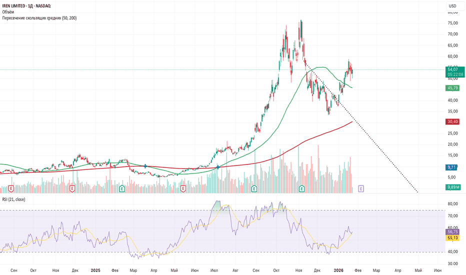 IREN возвращается к энергии ростаЦена IREN откатилась к нижней границе расширяющегося канала и протестировала скользящую среднюю 100 периода на 8 часах. Эта зона в районе 48 удержала цену раньше и снова показывает реакцию покупателя. Формируется локальная база. Прорыв уровня 62 откроет потенциал движения к 76 и далее к 100 где пр