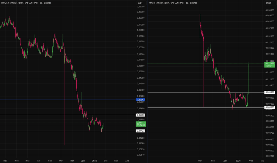 На графике PLUMEUSDT видно отчётливое затяжное нисходящее движение, которое продолжается уже несколько недель. Цена сейчас находится в зоне, где ранее был объёмный кластер покупок, что делает этот диапазон важным для возможного локального разворота.
