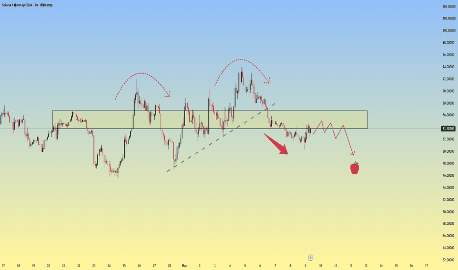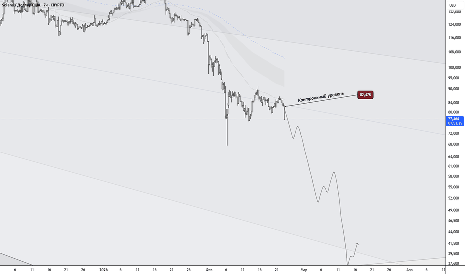 Диапазон SOL: сначала ликвидность снизуSOL продолжает торговаться ниже зоны 88–90, которая уже неоднократно останавливала рост. Текущее положение около 82–83 указывает не на попытку пробоя, а на консолидацию под сопротивлением. В таких условиях рынок чаще ищет ликвидность на противоположной стороне диапазона, прежде чем формировать новое